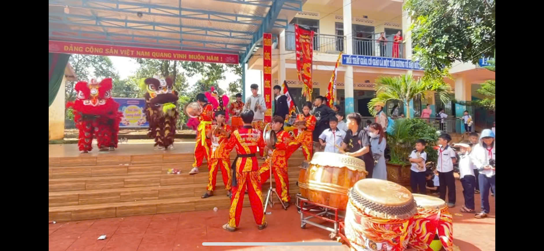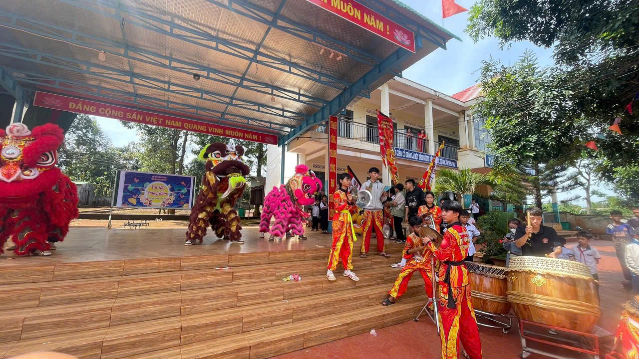 Các em tham gia xem múa lân với tiếng trống rộn rã, là một hoạt động sôi động không thể thiếu của ngày Tết.