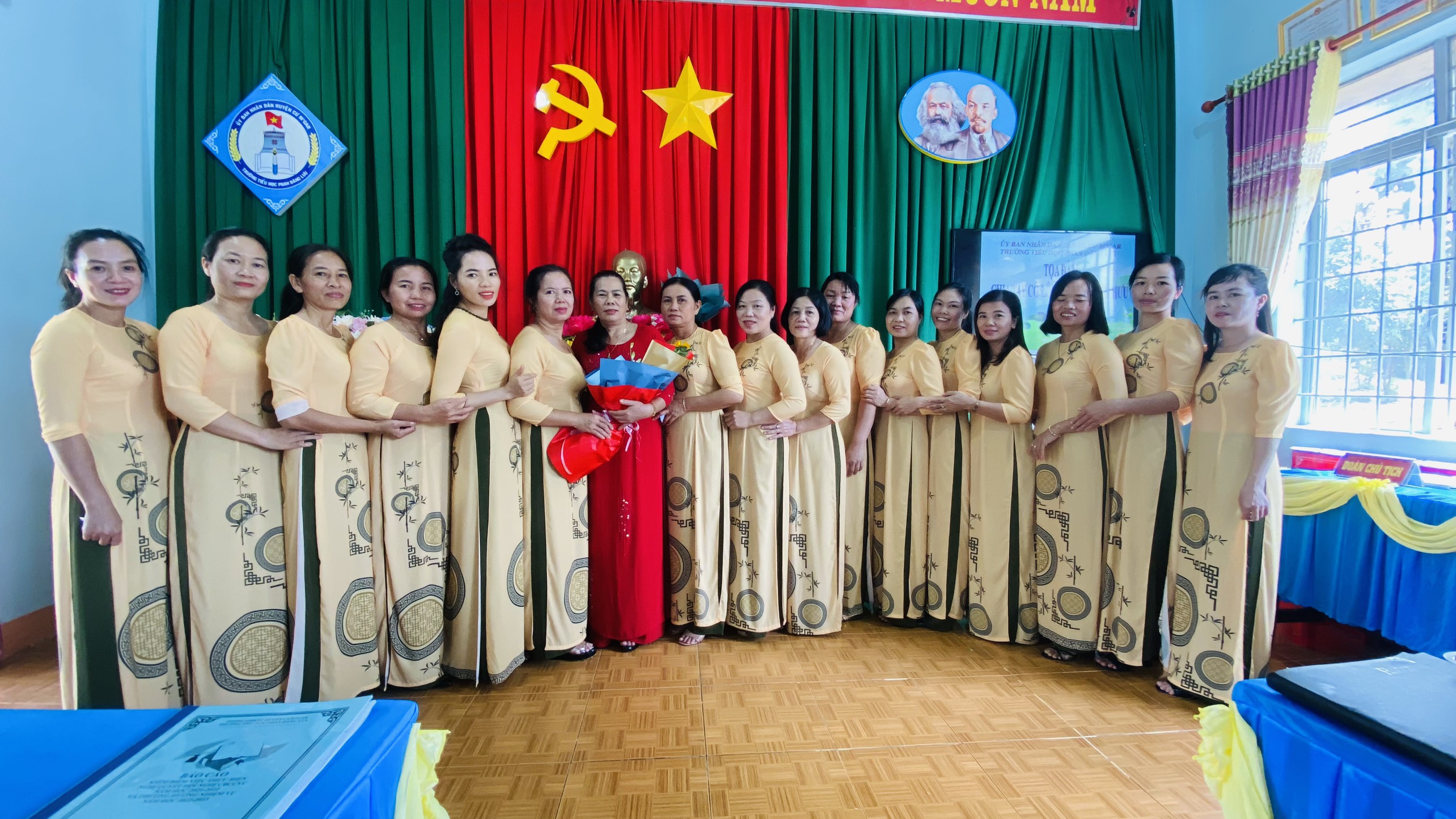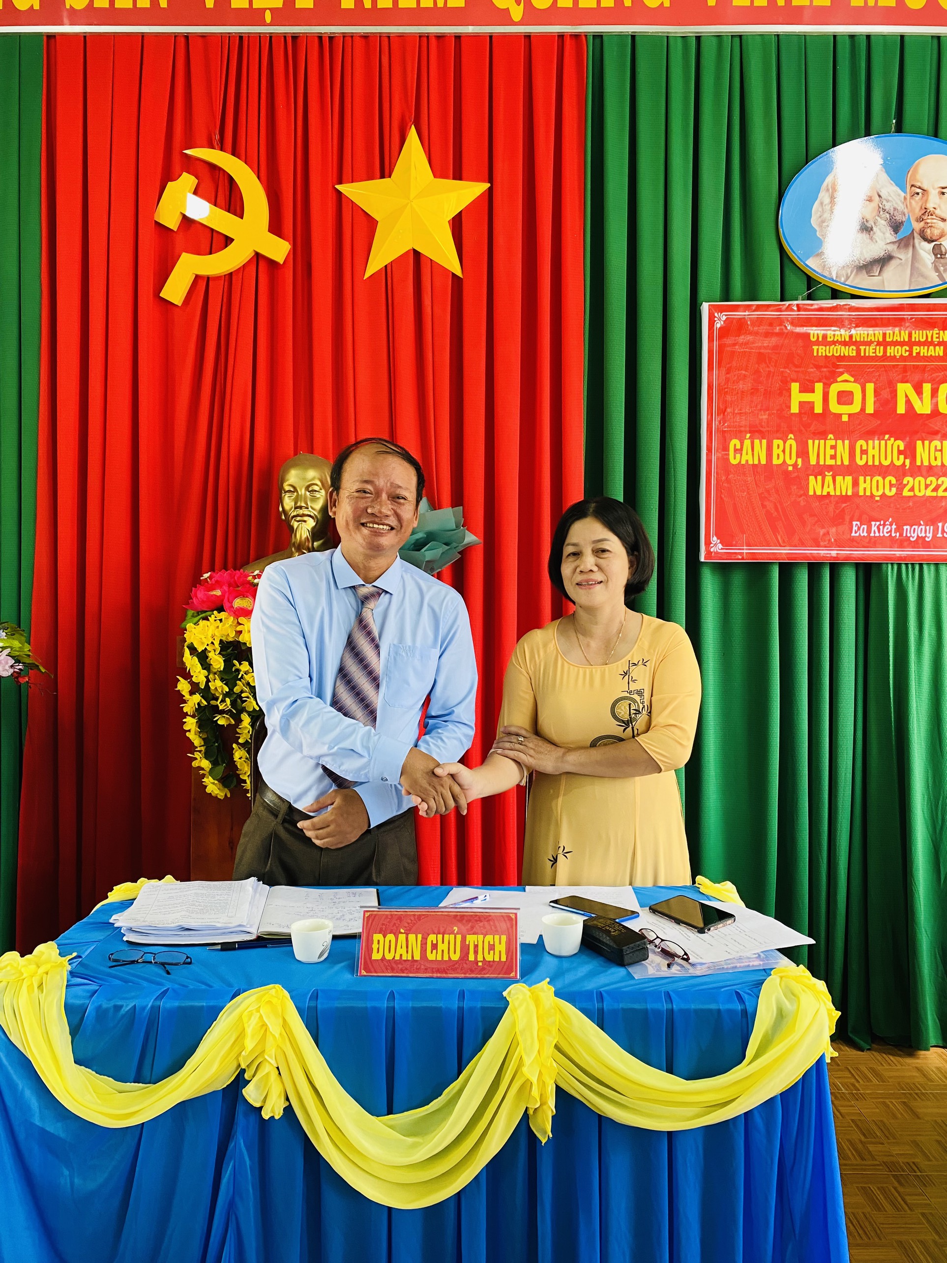 Đoàn chủ tịch gồm có các đ/c Lê Ngọc Tú – Bí thư chi bộ – Hiệu trưởng và Đ/c Vũ Thị Thúy La – Chủ tịch CĐCS. Thư ký Hội nghị có đ/c Trần Thị Nguyệt (TK Biên Bản) và đ/c Vy Thị Thúy (TK Nghị quyết).